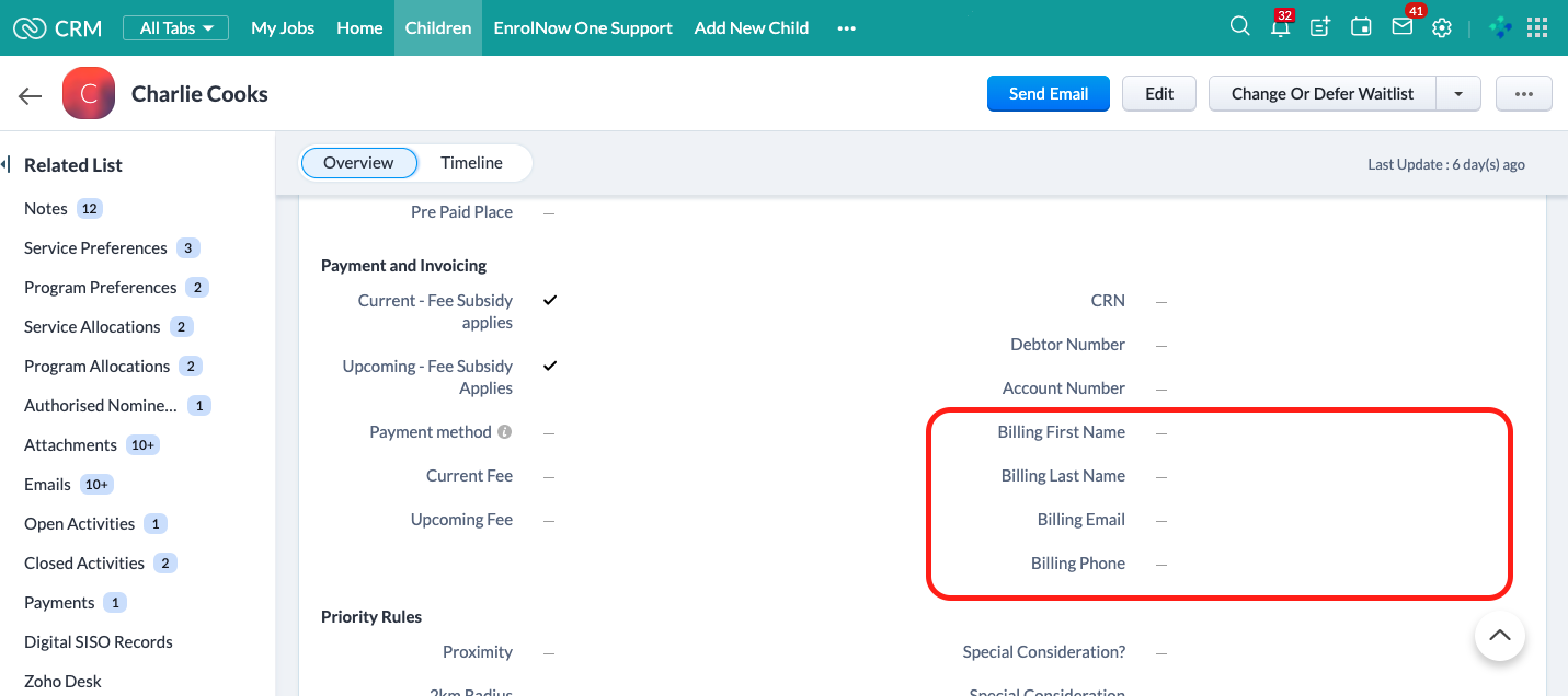 By default, invoices sent via Transact will be sent to the Parent / Guardian 1 details associated with a child. Where there is a need to send the invoice to an alternative email address you can add different billing details against the child record in EnrolNow One