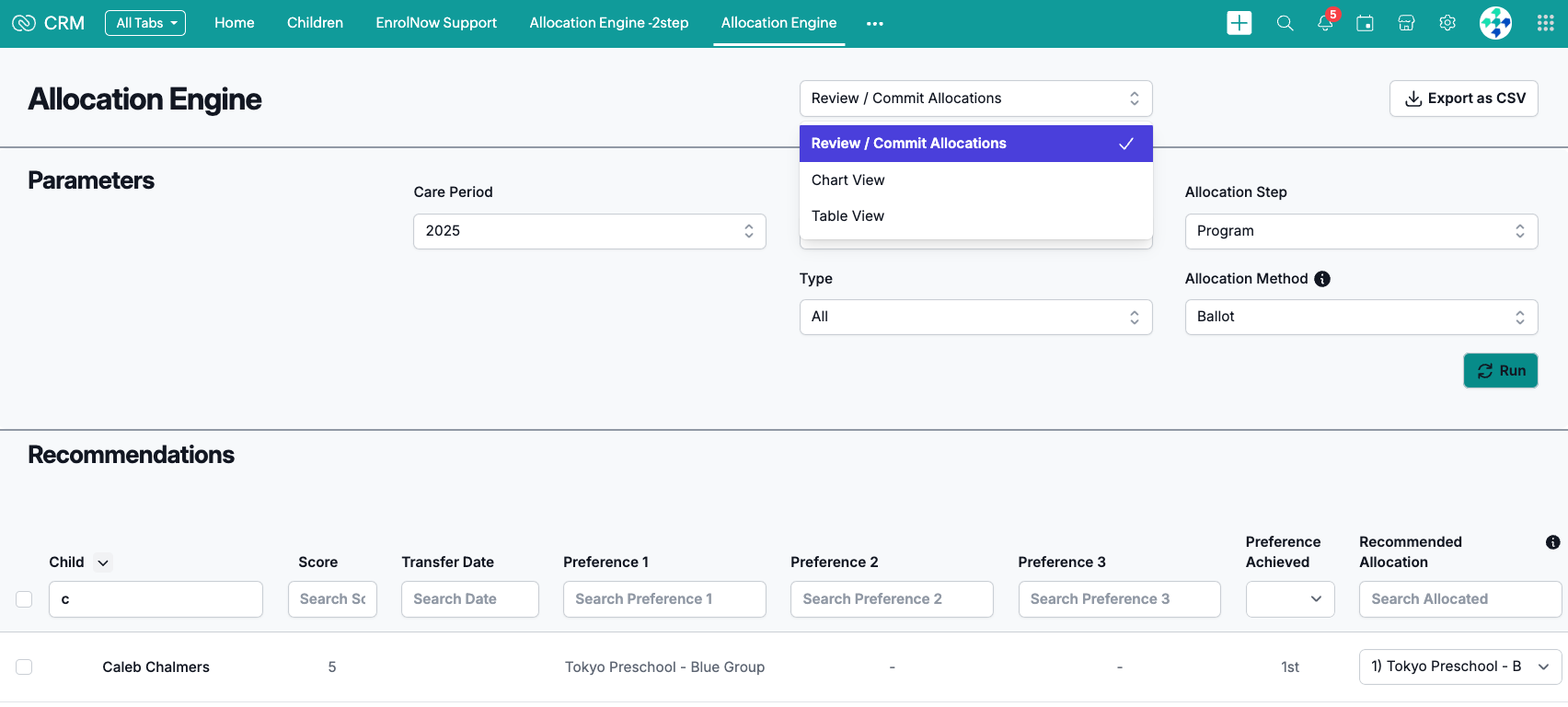 - Review / Commit Allocations: Tabular view of each child's score, preferences and the allocation engines recommendation