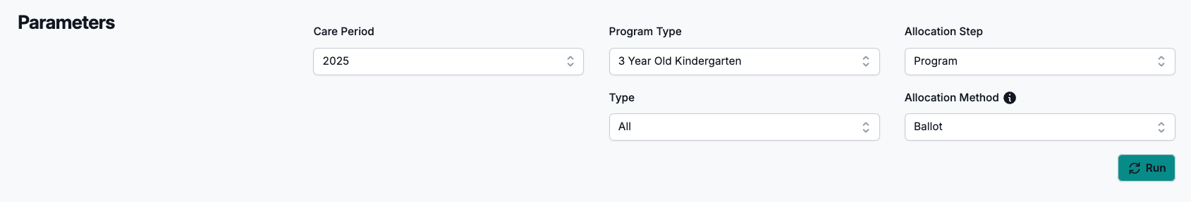 The parameters are used to define which children you would like to consider for allocation and the approach that the engine should take. Recommendations will not be displayed until you have selected the relevant parameters and clicked Run. Please note that changing the parameters will not automatically recalculate recommended allocations. You will need to select Run again to see the updated recommendations.