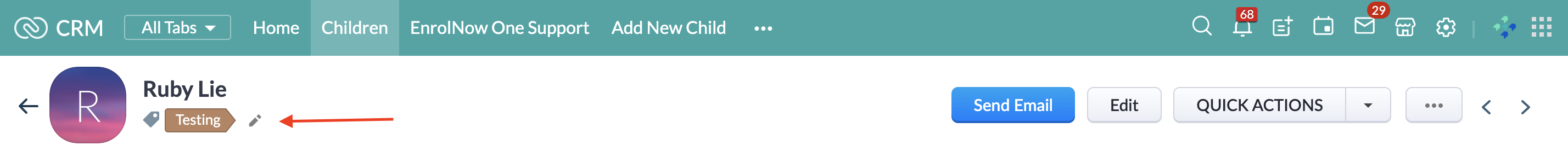 Tags can be removed from children individually or in bulk. First, you can display a list of records in the module with the same tag, by opening a record and clicking on the tag.