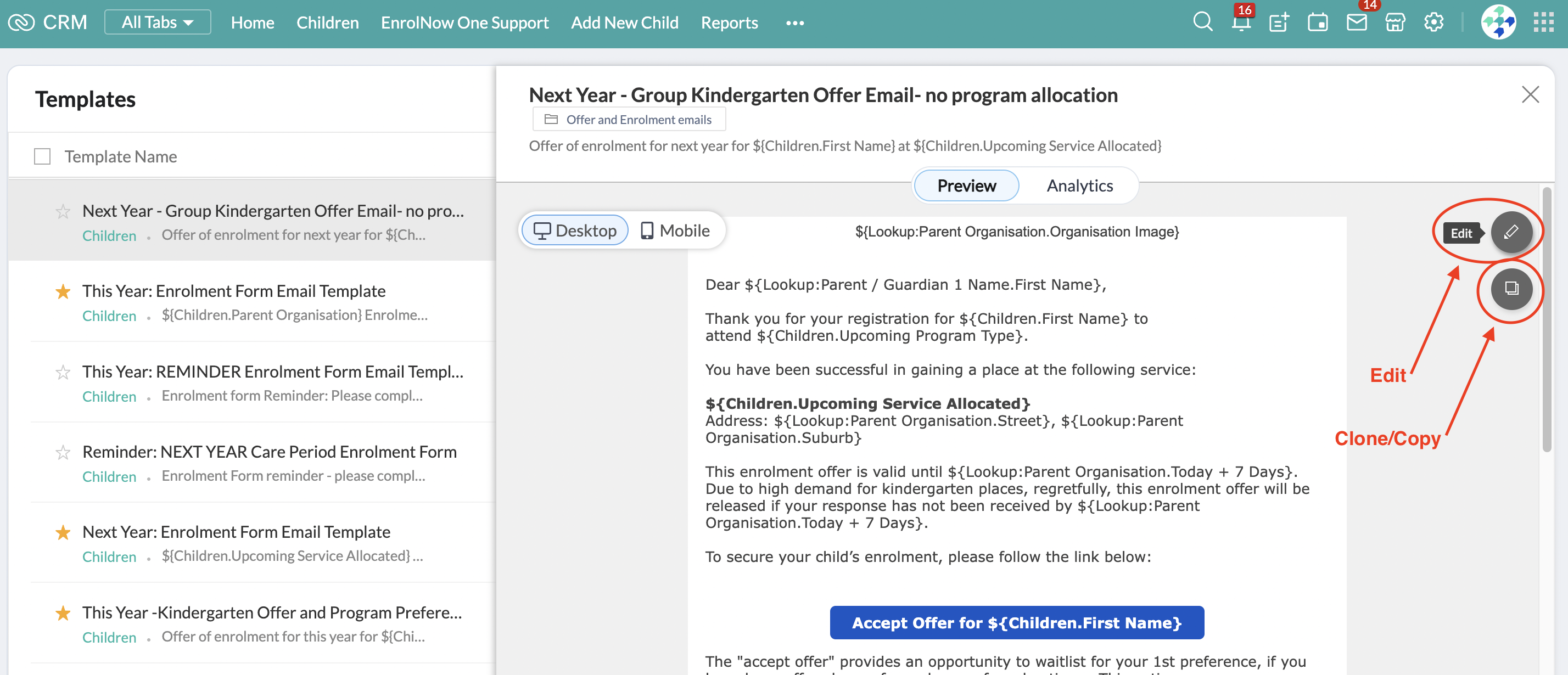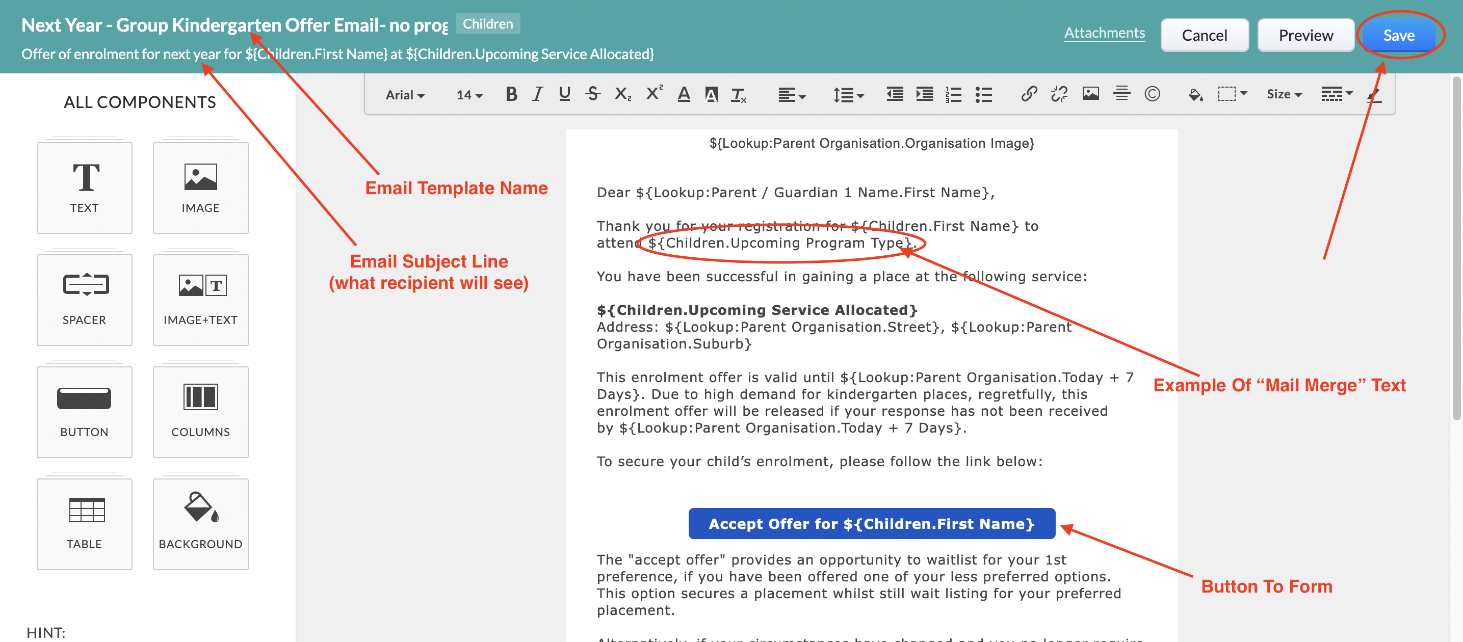 Please note: "Mail Merge" text is the text inside the "${......}" in an email template. Feel free to move around or delete these "Mail Merge" texts but if you need to modify these, please reach out to EnrolNow so we can assist you. Similarly, please do not modify the already setup buttons in an email template. If you need a button modified, please reach out to EnrolNow so we can assist.
