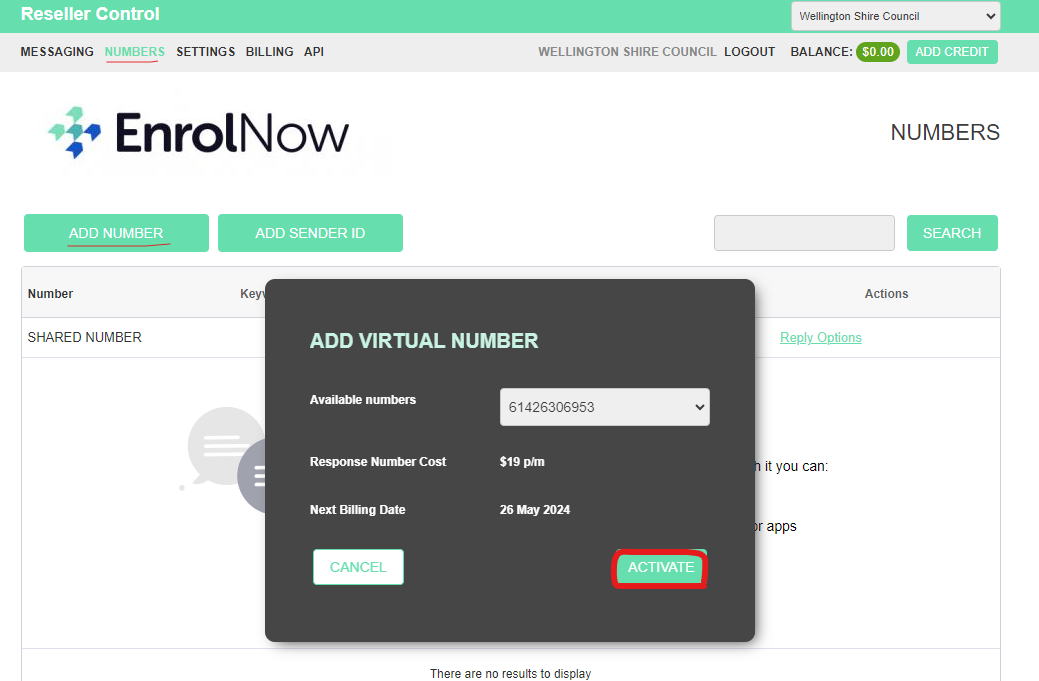 - navigate to NUMBERS > ADD NUMBER > ACTIVATE).