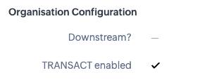 - Ensure 'TRANSACT enabled' boolean field is marked as true in the Organisation
