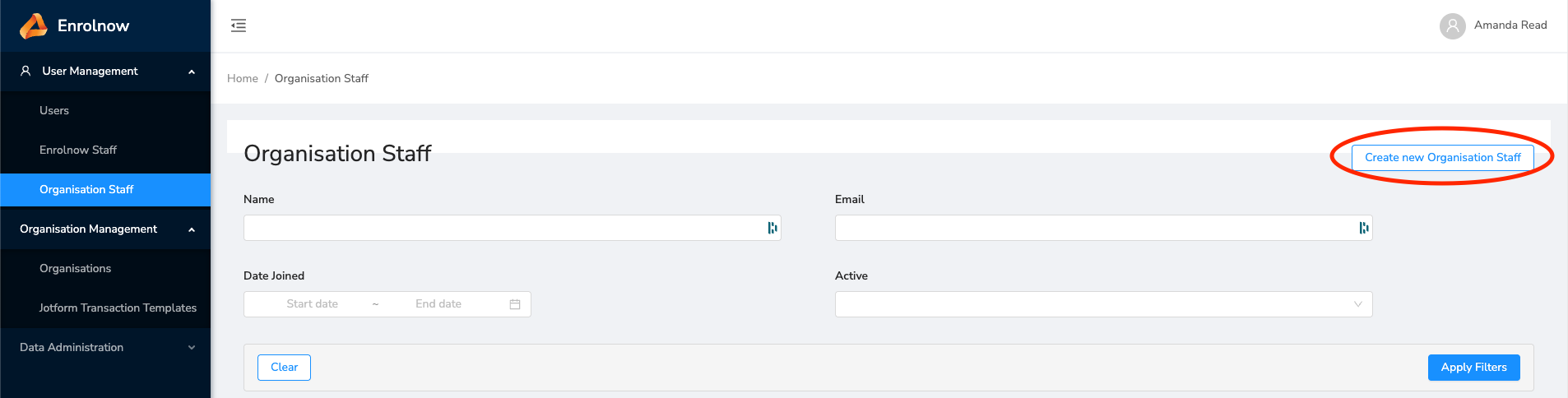 - Add the users under 'Organisation Staff' by selecting 'Create new Organisation Staff'