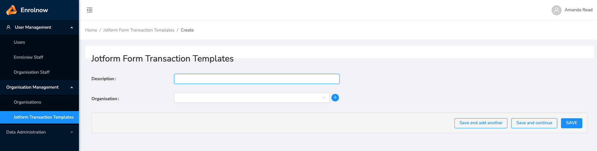 - Create the Jotform Transaction Template. Description should be the name of the service and select the correct Organisation from the drop down.
