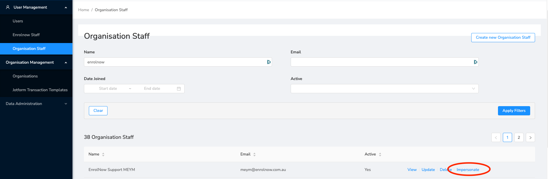 - Search for the Service User under 'Organisation Staff' and select 'Impersonate'