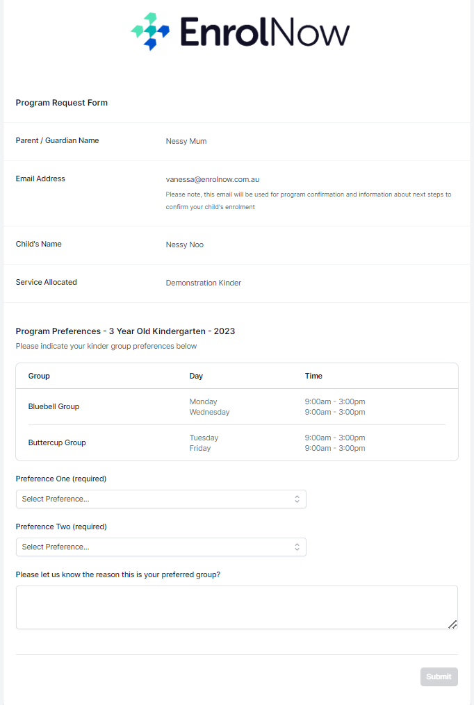 As the name implies the form is fully integrated with the EnrolNow system to ensure programs (or groups) created in your database are automatically reflected on your program preference form. Similarly when a family submits a program preference form their preferences are automatically recorded on their child record in the EnrolNow database.