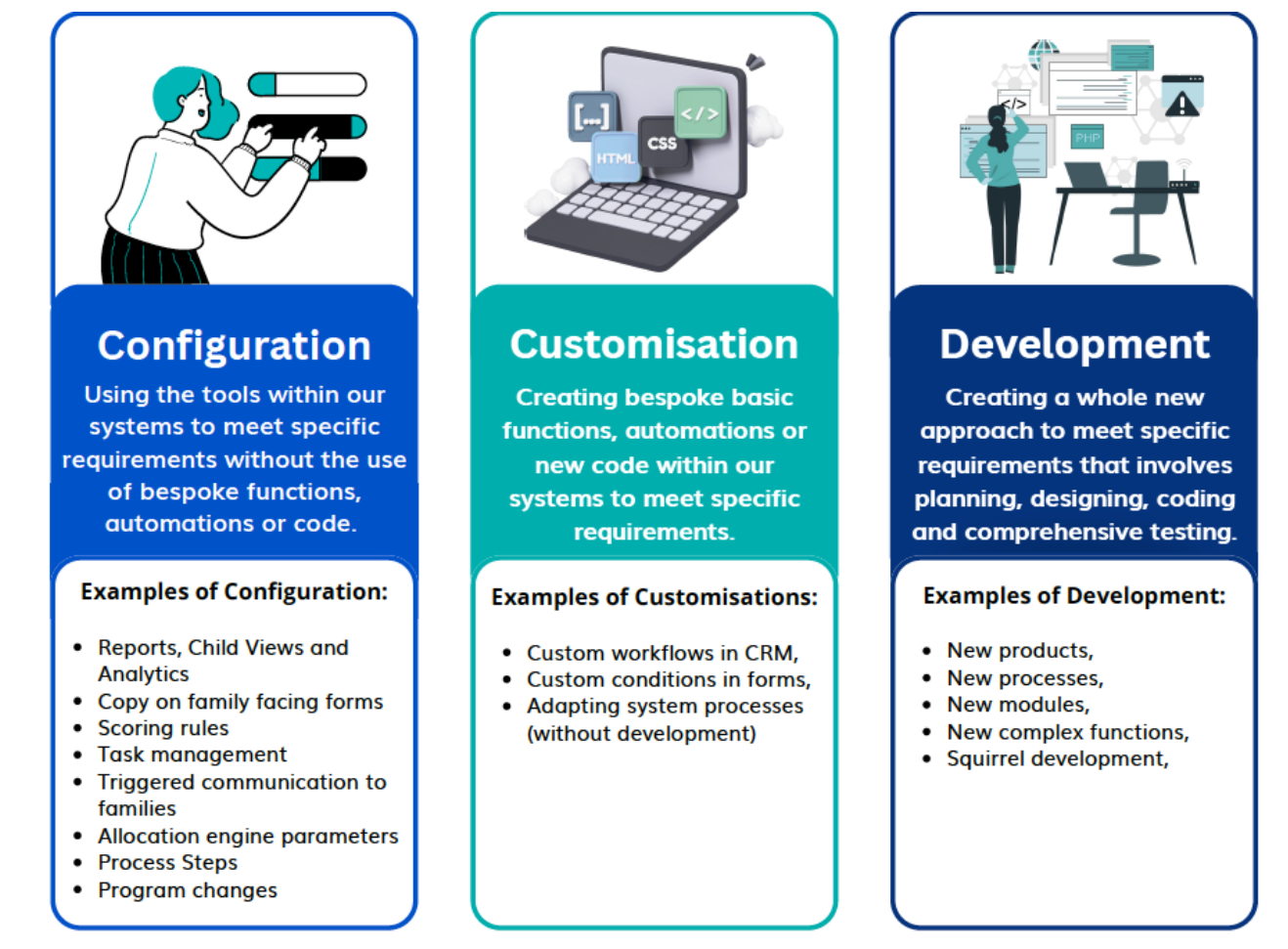 We recognise the importance of distinguishing between straightforward configurations, which are typically expected and supported as part of our service, and larger-scale customisations or developments, which may need to be understood and assessed before EnrolNow can commit to a possible approach.