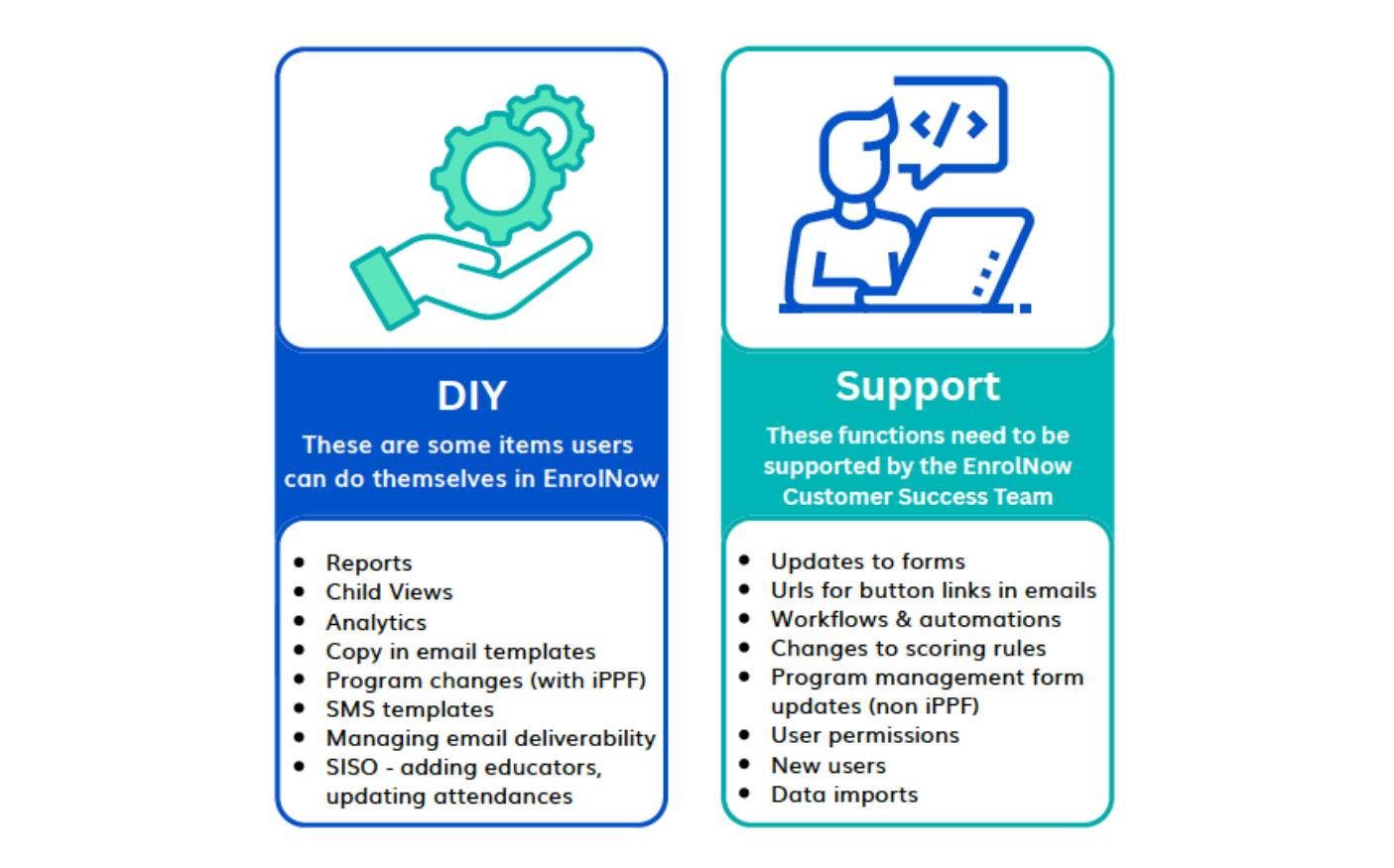 It's helpful to know what you are able to do yourself in your EnrolNow system — granted this may sometimes mean looking at help articles or asking for support assistance the first time. But being a SaaS product, there are some aspects that will always need to be supported by EnrolNow. Here are some examples: