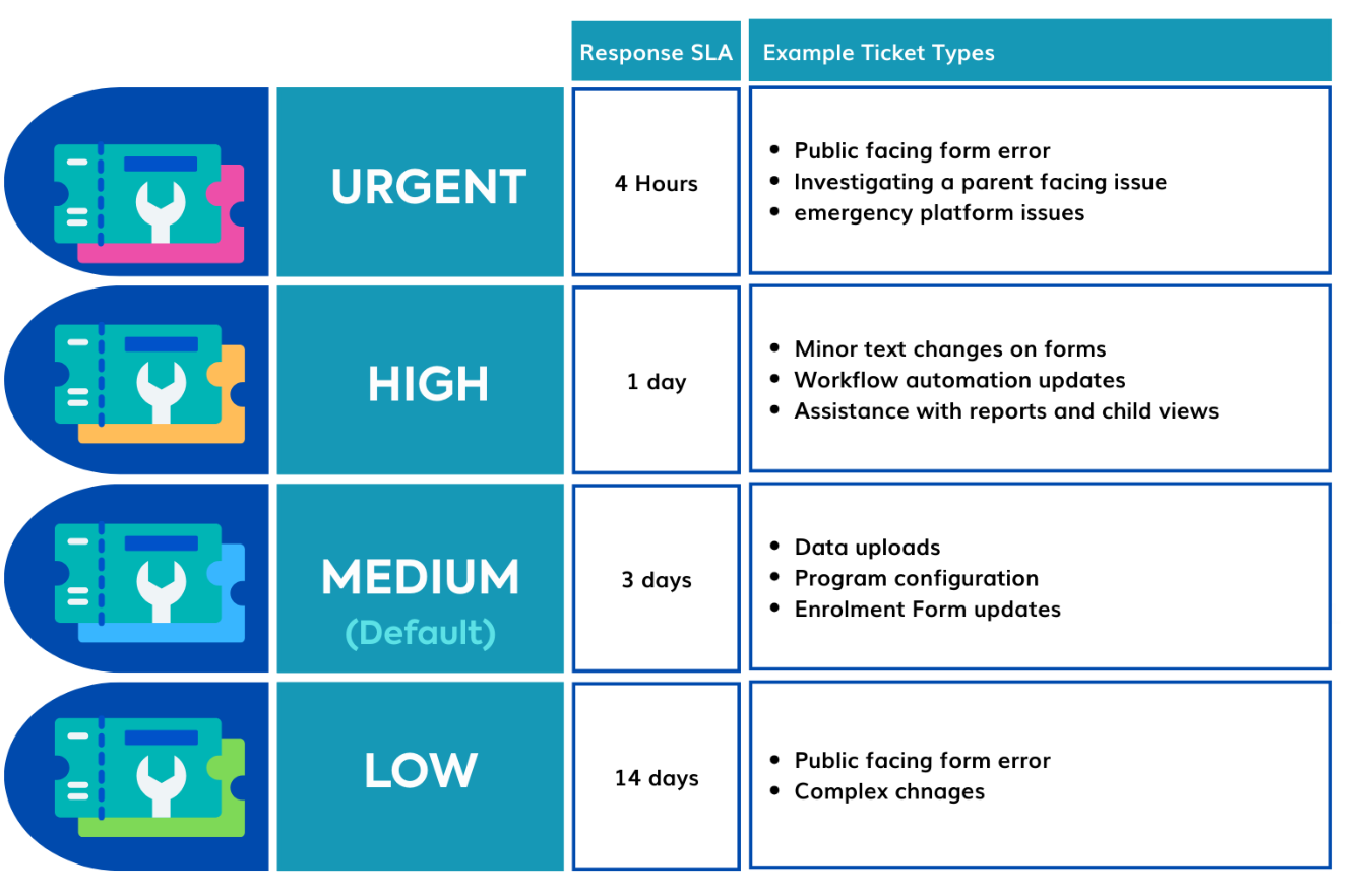 - Prioritisation: Ticket priority determines the response timeframe, as outlined in the EnrolNow Customer Commitment.
