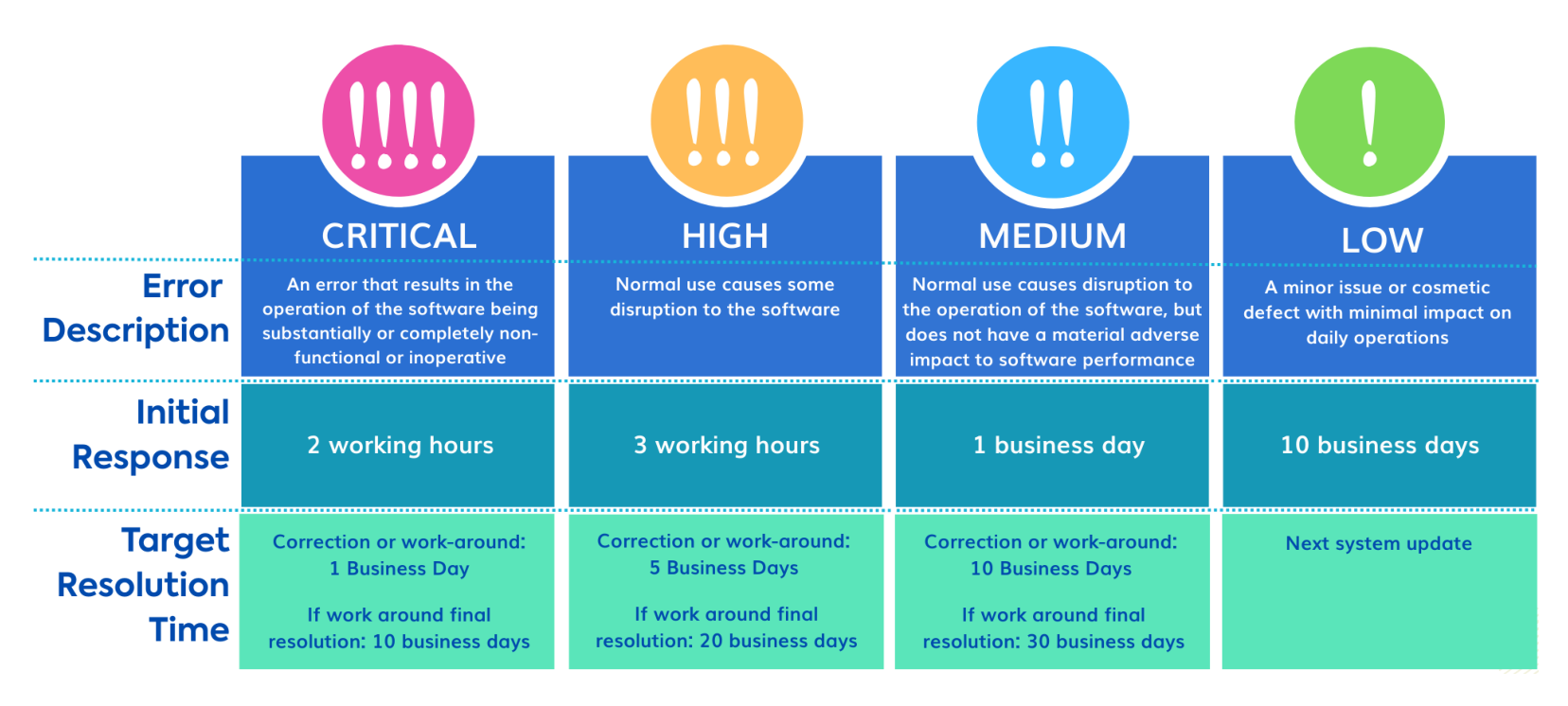 Our error resolution framework outlines how incidents are reported, prioritised, and addressed according to their severity and impact, ensuring minimal disruption to your operations.